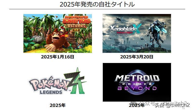 而任天堂也公开了2025年度预定登场的第一方游戏,其中《大金刚 回归》已经在1月16日发售,《异度神剑》将在3月20日发售,其余包括《宝可梦传说Z-A》、《银河战士Prime4:超越》则未定日期。