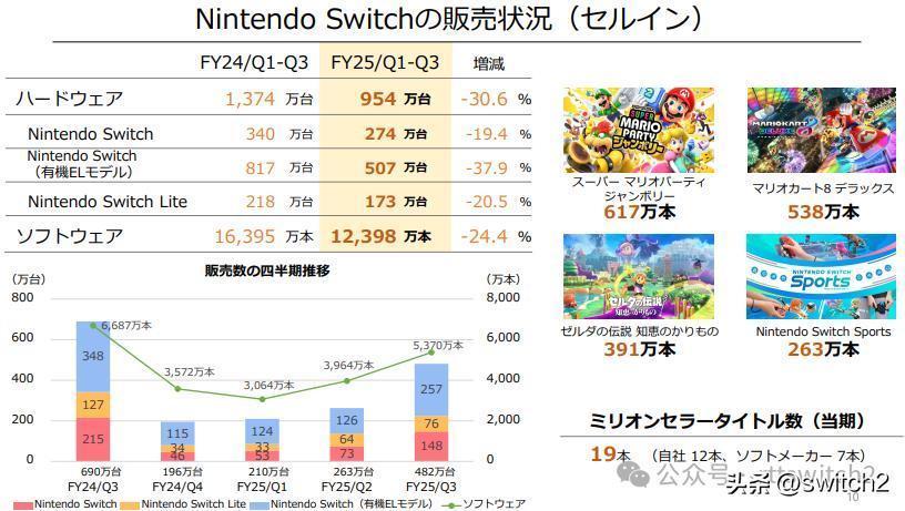 其中,Switch主机销量今年下降30.6%,仅为954万台。对比去年本期主机销量1374万台。