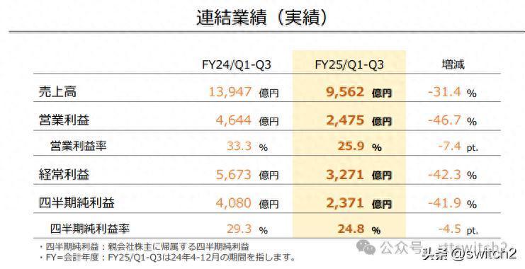 任天堂公布了2025年第三季度新财报,经营收益较去年同期锐减,总销售收入9562亿日元,较去年同期锐减31.4%,营业利润2475亿锐减46.7%,业绩预期也相应下调。